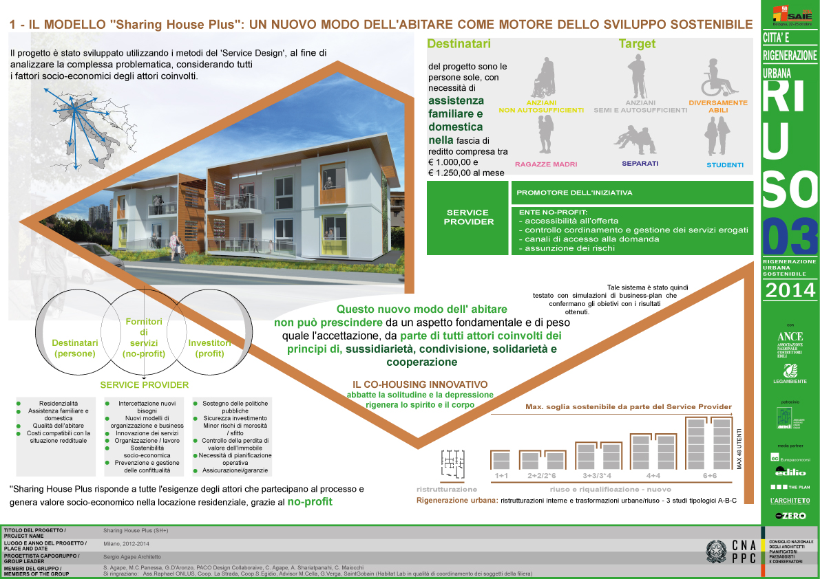 Il mercato immobiliare odierno (Istituzioni pubbliche e Investitori privati), non fornisce risposte sostenibili per chi è sopra soglia d’accesso al mercato “protetto” e non ha abbastanza economie per rivolgersi al mercato immobiliare privato che esclude la necessità di fornire servizi alla persona: ciò crea un’“area grigia”e molto complessa per le categorie deboli (anziani, ragazze madri, separati,…) che hanno bisogni ed esigenze specifiche. Gli obiettivi di SH+ sono quelli di dare una risposta a queste problematiche, perseguendo la sostenibilità sociale, economica ed ambientale, fornendo beni e servizi alle fasce deboli ed allo stesso tempo creando opportunità d’investimento (pubblico e privato). Al fine di avere un approccio omnicomprensivo che tenesse conto delle esigenze di tutti gli stakeholders, SH+ ha utilizzato tecniche e metodi del Service Design. Il progetto è supportato da un’analisi approfondita che ha sviluppato in 2 anni di ricerca tutti gli aspetti sociali, comportamentali, economici e gestionali. In particolare, la sostenibilità economica è stata dimostrata sul reddito delle persone di fascia tra 1000-1250 €, e proponendo un equo ritorno economico per l’investitore e per l’erogatore del servizio attraverso la simulazione con un BusinessPlan calato in diversi contesti (un caso studio è la tav 3 di Trezzano s/N), che adotta il riuso dell’esistente.
